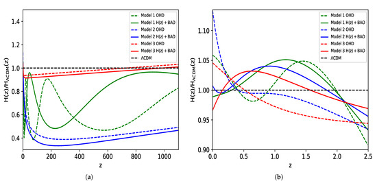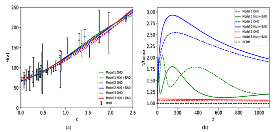 where n and N are the numbers of free parameters of the given model and of data points. For OHD, , and for + BAO combination, . The degrees of freedom is , which is used to determine the reduced , i.e., listed in Table 2. We will discuss the details of these best-fitting models in detail in the following section.