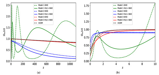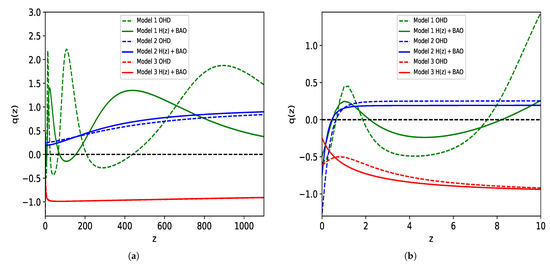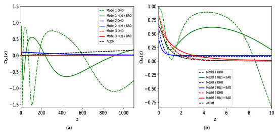 Therefore, the Model 1 OHD and + BAO cases are the best cases to alleviate the aging problems. In Figure 5, the redshifts when are 0.40, 0.91, and 1.99 (Model 1 OHD), 0.30 and 1.96 (Model 1 + BAO), 0.40 (Model 2 OHD), 0.04, 0.24, and 1.83 (Model 2 + BAO), 0.52 and 725.79 (Model 3 OHD), and 0.16, 1.56, and 984.77 (Model 3 + BAO); and the current values of are 0.49 (Model 1 OHD), 0.33 (Model 1 + BAO), 0.49 (Model 2 OHD), 0.47 (Model 2 + BAO), 1.03 (Model 3 OHD), and 1.01 (Model 3 + BAO). Note that the evolutions of dust matter density parameter and DE density parameter are shown in Figure 6 and Figure 7 up to , where for Model 1 OHD ( + BAO), the redshifts when have local extrema are 1.11, 4.26, 12.51, 41.89, 107.78, 356.20, and 928.41 (Model 1 OHD); 1.03, 4.72, 21.71, 115.98, and 455.68 (Model 1 + BAO); 3.98 (Model 2 OHD); 3.23 (Model 1 + BAO); 14.15 (Model 1 OHD); and 24.84 (Model 1 + BAO); while the redshifts when have local extrema are 1.11, 4.24, 12.51, 40.53, 107.27, 300.45, and 906.09 (Model 1 OHD); 1.03, 4.70, 21.67, 108.17, and 443.89 (Model 1 + BAO); and none for the rest cases. Since the universe has a slightly larger age in these best-fitting models, we also care about how it works with the expansion of the universe. The deceleration parameter is