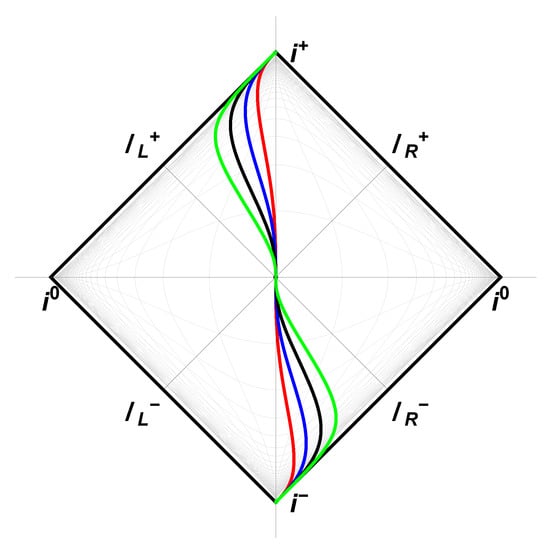 A Penrose diagram of the mirror trajectory, Equation (3). The mirror is moving at light-speed at . Since the acceleration is asymptotically zero as then this mirror is asymptotically inertial. The various colors correspond to different maximum accelerations; here from red, blue, black, and green.