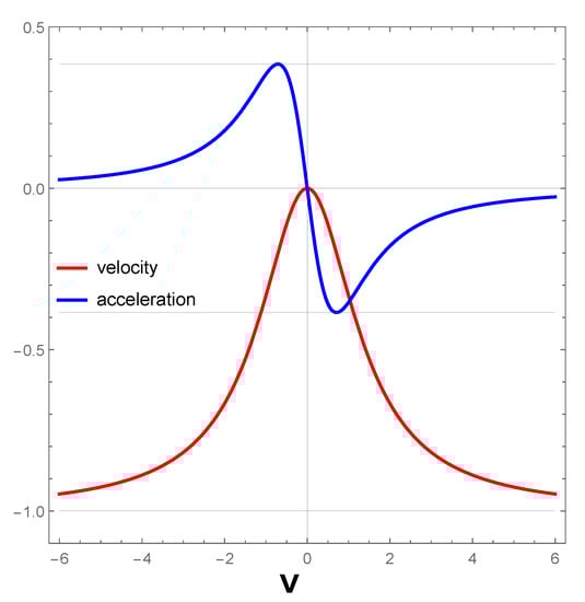 The velocity and proper acceleration as a function of light-cone coordinate advanced time for the mirror trajectory, Equation (3). At , the velocity , but asymptotically and the proper acceleration vanishes, . The maximum acceleration occurs at . Here v is in units of and the maximum accelerations happen at advanced time .