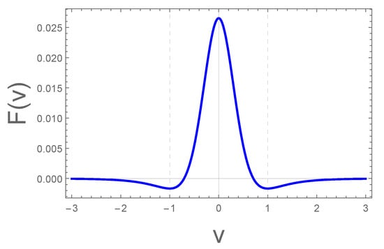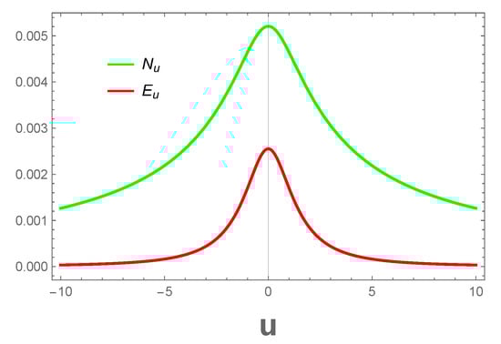 where the energy flux, , is a function of light-cone coordinate retarded time [4,34] and the brackets define the Schwarzian derivative. The trajectory in light-cone coordinates of the mirror is which is the advanced time position “v” as a function of retarded time u. However, since we want advanced time v as the independent variable, we write the radiated energy flux using [16,21],