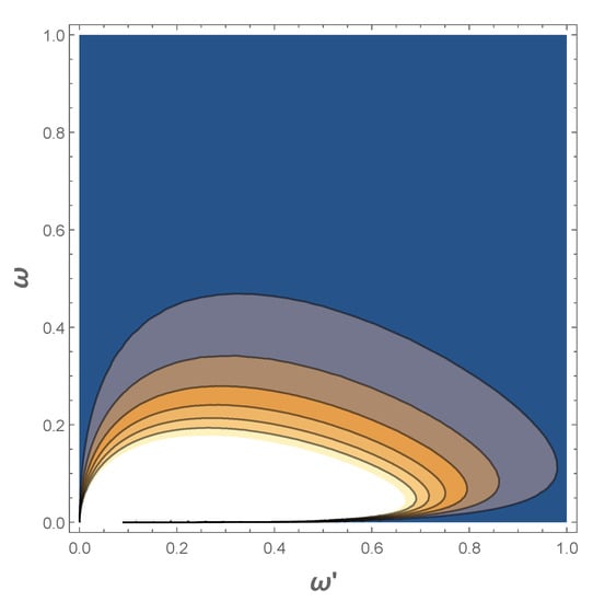 The time dependence of particle creation can be computed via wavepacket analysis treated in Hawking [11], and explicitly numerically computed in [27,28]. Wave packet localization, particularly via orthonormal and complete sets in the moving mirror model, was first carried out in detail in [41]. For completeness, we utilize the same code to illustrate particle creation in time and present the results in Figure 7. The rate of emission of particles is finite only in a given time and frequency interval which can be seen by these complete orthonormal family of wave packets constructed from the beta Bogoliubov coefficients, following Hawking’s notation,