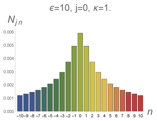 where and n are integers. These packets are built at future right null infinity, , and peak at delayed exterior time, , with width . Therefore the vertical axis in Figure 7 has a discrete and intuitive physical interpretation, giving the counts of a particle detector sensitive to only frequencies within of , for a time at . Late times correspond to large quantum number n (for the mirror Equation (5), late times have ). For excellent time resolution, only one frequency bin is needed, where the particles pile up, , and a relatively large value of resolves the count in time. The text of Fabbri-Navarro-Salas [42] also describes the details needed to reconstruct Figure 7 by first packetizing the beta coefficient as done in Equation (34) and then secondly numerically integrating over from 0 to ∞, and third, computing the results, ,