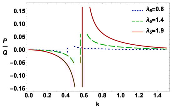 The propagation of IAWs is modulationaly stable when P and Q have the opposite sign (i.e., ), and is modulationally unstable when both P and Q have same sign (i.e., ) [54,55]. The point, at which the transition of curve intersects with the k-axis in the “ versus k” graph, is known as threshold or critical wave number [54,55]. We have depicted the variation of with k for different values of under the consideration of fast () and slow () IA modes, respectively, in Figure 1 and Figure 2, and it can be seen from these two figures that (a) both stable and unstable parametric regimes are allowed by the plasma system; (b) the increases (decreases) with increasing of positive (negative) ion number density when their charge state remains constant; (c) the stable parametric regime (i.e., ) increases (decreases) with positive (negative) ion charge state when their mass remains constant.