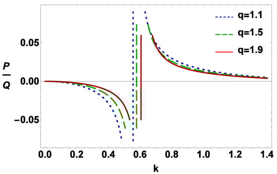 The variation of with k for different values of q when , , , , , , and .