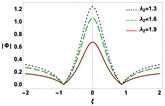 It can be seen from the literature that the PI plasma system can support these conditions: (i.e., [4,5,6,7,8,9], [17,18,19,20], and [17,18,19,20]), (i.e., [4,5,6,7,8,9] and [23,24,25]), and (i.e., [5,6]). So, in our present investigation, we have graphically observed the variation of electrostatic potential with under the consideration of (i.e., ) in Figure 5, and it is obvious from this figure that (a) the amplitude and width of the IARWs decrease with an increase in the value of the negative ion mass but increase with an increase in the value of the positive ion mass for a fixed value of their charge state; (b) the height of the IARWs increases (decreases) with negative (positive) ion charge state for a constant mass of positive and negative ion species. So, the mass and charge state of the PI play an opposite role to the formation of IARWs in PI plasama. Figure 6 describes the nature of the electrostatic IARWs with the variation of under the consideration of (i.e., ). It is clear from this figure that (a) the amplitude and width of IARWs increases (decreases) with negative (positive) ion mass when other plasma parameters are constant; and (b) the existence of the heavy positive ion change the dynamics of the plasma system. So, the dynamics of the DPP rigourously changes with these conditions (i.e., ) and (i.e., ).