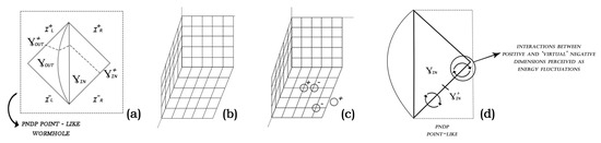 In (a), it was represented the wormhole introduced and studied in Reference [27], in which we consider it created by a PNDP in a point-like version. The curve represents the entrance, while the curve represents the exit. In (b), a vacuum place in space-time is represented. In (c), pairs of virtual particles are represented, particle-anti particle that annihilate. So, (b,c) represent the phenomenon known as quantum fluctuation, i.e., fluctuations in the energy of the vacuum that suddenly generate particle-antiparticle pairs that annihilate. Here, we assume that this could be generated by (a), i.e., the interactions between the dimensions that generate the wormhole point like, are perceived, in the entry and exit areas, as virtual energy fluctuations, as in (d).