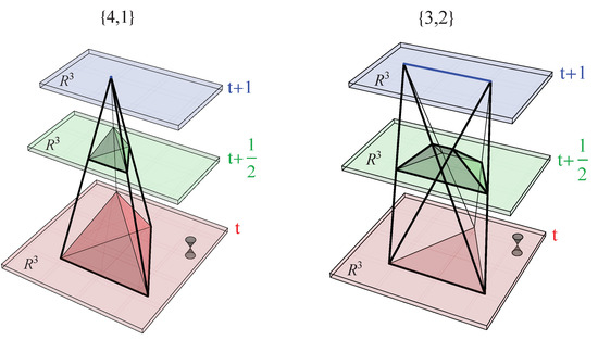 Let us briefly describe how CDT implements the lattice version of a four-dimensional hyperbolic manifold with a Lorentzian geometry (for details, we refer to [1]). First, one chooses integer time labels . For each such time , one constructs a three-dimensional Euclidean piecewise linear manifold by gluing together three-dimensional tetrahedra with link lengths . All have the same topology, which we denote . The four-dimensional slab between two three-dimensional triangulations at and is now “filled out” by four-simplices that have four vertices at (i.e., they form one of the tetrahedra there) and one vertex at . We denote such a four-simplex a (4,1)-simplex. Alternatively, a four-simplex can have three vertices at (which form a triangle, shared by two of the tetrahedra at ) and two vertices at (which form a link shared by a number of tetrahedra at ). We denote such a four-simplex a (3,2)-simplex. The construction is illustrated in Figure 1. Analogously, one can construct (2,3)-simplices and (1,4)-simplices. For each of these four-simplices, the links connecting and are considered time-like with proper length squared , . The gluing of these four-simplices should be such that the topology of the slab between and is . In the CDT path integral, one now performs a summation over all possible three-dimensional triangulations for each of the time slices with topology and all possible ways to connect two neighboring time slices in the way described above. The lattice spacing ε is the UV cut-off in the path integral. In a continuum path integral, we would like to use the Einstein–Hilbert action. There might be good reasons to also include higher derivative terms, but here we will restrict ourselves to the Einstein–Hilbert action, which has a natural geometric representation on piecewise linear manifolds, known as the Regge action [35] (for attempts to add in an explicit way higher curvature terms to the Regge action, see [36]). One important aspect of the CDT construction is that we, for each four-dimensional triangulation, can perform a rotation to Euclidean geometry by rotating via the lower complex plane. By such a rotation, we have the following transformation of the Regge action for a Lorentzian CDT triangulation to an Euclidean triangulation : . Because our piecewise linear manifold is constructed by gluing together only the two kinds of four-simplices shown in Figure 1, the Regge action becomes very simple, and remarkably, it depends only on the total number of (4,1)-, (1,4)-, (3,2)- and (2,3)-simplices, the number of vertices , the asymmetry parameter and the bare lattice coupling constants. After the rotation to an Euclidean triangulation , the Regge action can be written as