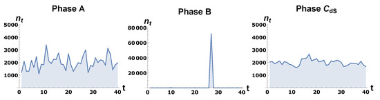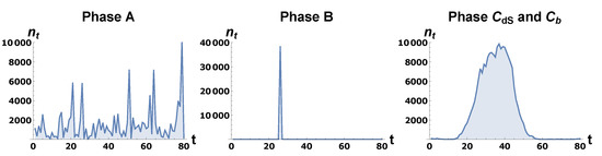 Typical volume profiles in various CDT phases with toroidal spatial topology . The volume profile in the phase is similar to the profile for .