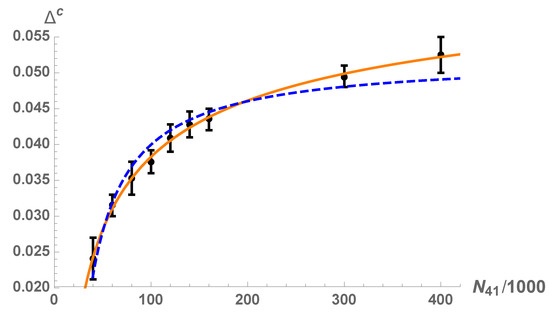 Lattice volume dependence of the pseudo-critical values in CDT with toroidal spatial topology and for fixed together with the fit of the finite size scaling relation (3) with critical exponent (orange solid line) and the same fit with a forced value of (blue dashed line).