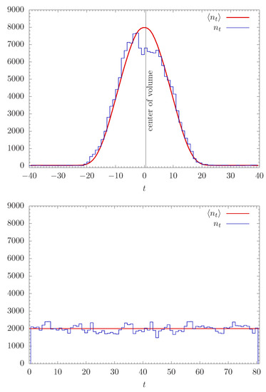 Top: the projection of four-volume, as defined by (20) in one spatial direction (x, y or z) for a typical CDT configuration with small jump magnitude . Bottom: The projection of four-volume, as defined by (20), in one spatial direction (x, y or z) for a typical CDT configuration with large jump magnitude . The horizontal axis is .