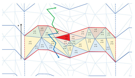 Once the boundaries of a toroidal triangulation are defined, they can be used to erect what we denote a pseudo-Cartesian coordinate system. Let us consider a spatial boundary, e.g., the x-boundary of an elementary cell. For every (dual lattice) link that crosses the boundary with value , we assign to vertex j a coordinate . From each already visited vertex, we move to the neighboring vertices, but we are not allowed to cross the boundary in the negative direction. We mark these vertices with coordinate and continue this way until each vertex in the dual graph has an x-coordinate. The way this is actually done is by studying a discretized version of a diffusion equation on the dual lattice; for details, we refer to [26]. It is also possible to cross the boundary in the negative direction, and we can assign a coordinate to the vertices we meet on the negative side of the boundary and then extend this construction to each vertex, as for the x coordinate. In this way, each vertex v has two coordinates: and . The construction described is illustrated on a two-dimensional lattice in Figure 7.