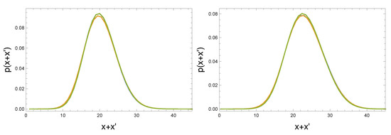 Distributions of (blue), (green) and (orange) for systems with (left) and 160k (right) and . One can show that the distributions scale as .