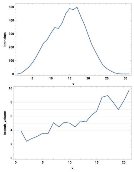For a detailed analysis, we refer to [26], and here let us just describe the situation qualitatively: given a simplex, i.e., a vertex v on the dual lattice, with coordinate , we can identify the vertices with coordinates , where in addition w is connected to v by moving only between vertices u where . We call such a set the slice associated with v. The set of all vertices with coordinate will in general consist of a set of disconnected slices. A slice at is connected via links to precisely one slice at but can connect to many (or zero) slices at . All vertices at are connected and thus form a slice, which we denote the root of the trunk, where the trunk consists of the slices which are connected with slices of increasing x all the way from the root to the “top” boundary of the cell. The trunk may split into several pieces when reaching the top boundary. Furthermore, starting at a slice at and following its connections to slices at , etc., this set of slices might never reach the top boundary. We call such a set of slices a branch, and the branches clearly have a tree structure. All this is in principle illustrated in Figure 7, where the deep red triangle with coordinate labels is a branch. Figure 9 shows, for a large triangulation, the number of branches one encounters at coordinate x and their corresponding volumes. The number of branches is large, but their volumes are not that large. The existence of these branches and the corresponding disconnectedness of the hypersurfaces of constant x implies that the pseudo-Cartesian coordinates are not an optimal choice of coordinates; in Section 5, we will introduce a better set of coordinates. However, they highlight the fractal structure of a typical geometry, which seems to share a number of characteristics with the fractal geometry encountered in 2d DT [39,40,41] and in the so-called generalized 2d CDT [42,43], something definitely worth exploring. It turns out that we can dissect the fractal structure slightly further by using the non-contractible loops introduced and the periodic structure of the triangulations. We now turn to this topic.