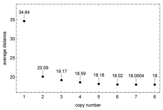 According to our discussion, the shortest loops should wind around the center of the torus. Thus, it is convenient to denote the length of the shortest non-contractible loops of a vertex v as height labels , telling us how far inside an outgrowth v is. Evidence for such an interpretation can be found by using the representation of the torus as a repetition of elementary cells on . On , each copy of the elementary cell is labeled by “cell coordinates” , constructed from the number of times one passes the cell boundaries from the starting elementary cell. By studying the above-mentioned diffusion equation on , we can then find the shortest path between copies of a vertex v in the other cells. The length of such a path is not necessarily just a multiple of the length of the shortest path between v in neighboring cells, the reason being that we can increase the winding number of a loop going through a vertex in an outgrowth by first moving to the central part and then circling a number of times around the center before finally moving out in the outgrowth again in order to close the loop. This is illustrated in Figure 11. For the particular configuration used in the figure, the shortest loop in the x-direction is 18. Furthermore, it turns out that for this configuration, there is only one loop of length, 18. Rather remarkably, if we we ask for the shortest loop winding eight times around the torus in the x-direction, it will wind around at least one time following precisely this shortest loop, no matter from which vertex v we start.
