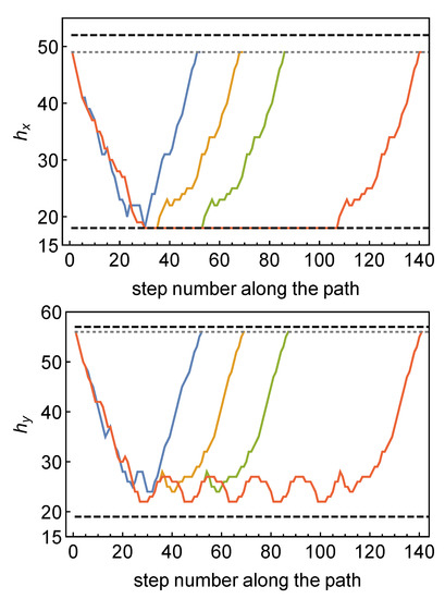 Heights in 2 basic directions of consecutive simplices along loops of winding numbers (blue), (orange), (green), (red) starting from a simplex in an outgrowth. The dashed lines indicate the minimal and maximal heights in the configuration, and the dotted line indicates the height of the initial simplex.