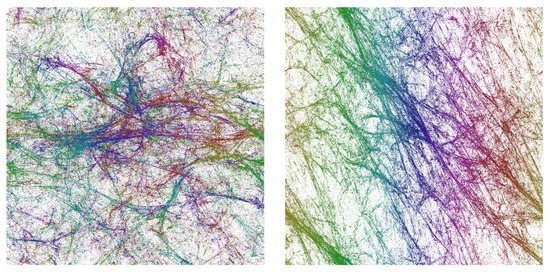 We can measure the full four-dimensional distribution , but to present it graphically, we show in Figure 13 the projections of the volume density distribution of a typical configuration on the -plane and the -plane, respectively, integrating over the remaining two directions. One observes a remarkable pattern of voids and filaments [28], which qualitatively looks quite similar to pictures of voids and filaments observed in our real Universe.