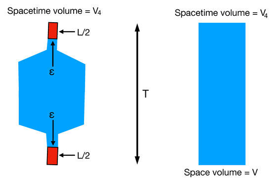 In the left plot, we have a torus with spacetime volume and time length T. It is pinched such that the space volume is during a time length L. The field changes uniformly from 0 to over a distance in the lower red part. In the blue part , and in the upper red region, the field changes uniformly from to . The total matter action of this field configuration is then
