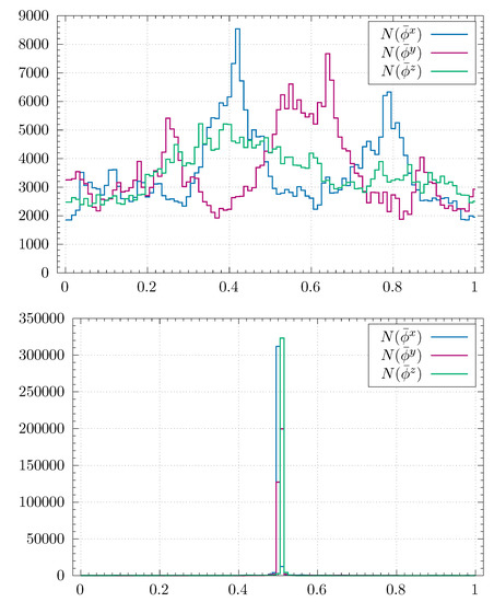 The first thing to be aware of is that the computer simulations change the connectivity of the triangulations. While the change by construction respects the time foliation, there is no such restriction in the spatial directions. If the starting configuration was constructed with topology, the local changes of the triangulation made by the computer simulations will preserve this topology, but not any initial foliation of . If we want to make maximal use of the periodic structure of a triangulation with topology, we have to identify such structure, and since it is in no way unique (even for a regular triangulation), we also want a “reasonable” periodic structure, which is a somewhat non-trivial task if the triangulation is quite fractal. Let us briefly describe how we define the periodic structure (for details, we refer to [26]). The idea is to start with a regular triangulation where the periodic structure can be defined in a trivial way (see again [26] for details) and then keep track of this structure and modify it appropriately, such that when the triangulation is changed in the Monte Carlo simulations, we can still identify a “reasonable” periodic structure despite having quite a fractal geometry. The periodic structure will be defined by boundaries, and it is convenient to view as an infinite system of elementary cells in , separated by these boundaries. In order to keep track of the boundaries, we introduce a labeling of the dual lattice. Each simplex in the triangulation is represented as a vertex in the dual lattice, and each tetrahedron, being the boundary between two simplices, is represented as a link between the two vertices i and j on the dual lattice. The concept of the spatial directions (and time direction) is well defined for our nice starting triangulation, which is a triangulation of a hypercube whose opposite sides are identified, and thus we can use it to define boundaries that are “orthogonal” to what we denote and t directions, and where the t direction will coincide with our CDT time direction. We label the three spatial boundaries and z, as we will try to define coordinates where the boundaries correspond to , etc. We now assign four values (a four-vector, one can say) to each link , where or t. The value 0 corresponds to the case when both i and j belong to the same cell. Values imply that the link crosses the -boundary between two cells in the positive or in the negative direction. If we have a closed loop of dual links, defined by a sequence of vertices , , where (up to the cell number), we may form the sum of vectors along the loop. For a contractible loop, the sum must be the zero vector, while for a non-contractible loop (closed by the periodic boundary conditions), the sum gives topological information about the winding number of the loop. The boundaries are not physical, and the Einstein–Hilbert action (1) does not depend on the boundaries. The computer algorithm changes one triangulation into another one by performing local changes. When we perform such changes, we check if the boundaries between elementary cells pass through the affected region of the triangulation. If not, we perform the change of the triangulation as if the boundaries were not there. If a boundary between two cells crosses the affected region, we deform the boundary, but not the triangulation itself, in such a way that it is still connected but outside the region. We then perform the change of geometry, and we try to modify the boundary in the new geometry such that its size, i.e., its three-volume, will be minimized. From time to time during the computer generated changes of the triangulation, we check if a local modification of boundaries can minimize the three-volumes of the boundaries in all directions. In this way, we try to keep the boundaries “reasonably" small during the changes of the triangulation generated by the computer.