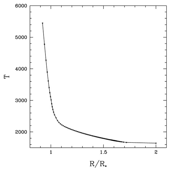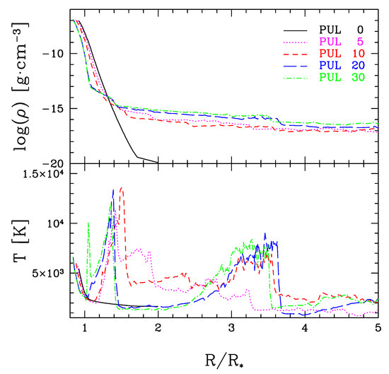 The initial hydrostatic model is computed by mean of an iterative process with a IV-order Runge-Kutta method. Initial stellar parameter are: M = 1.2 M and L = 5315 L (this determines a stellar radius R = 270 R, equivalent to 1.88 × cm). Moreover, at the photosphere, the temperature is fixed to T = 3000 K. The CSE is assumed to have an initial extension of 2 stellar radii.
