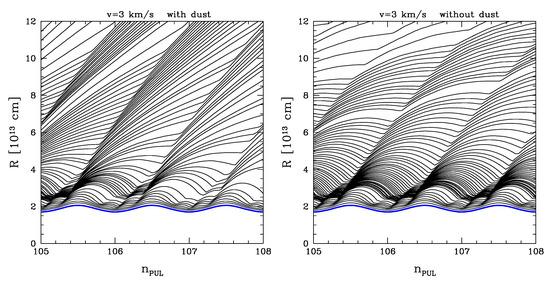 In order to evaluate the effects of dust on the time evolution of the radii, we run a model without the contribution of dust. Such a model is shown in the right panel of Figure 4. It is clear how much dust contributes to the outward drift, magnifying the deviation from a ballistic behavior. For instance, during a time interval corresponding to 3 pulsations, a zone with almost increases its radius by a factor of about 2.5 for pulsation 105 in the model with dust. On the contrary, in the case without dust the radius growths of 10% only. This suggests that the winds in AGB stars could be pulsation-driven dusty winds.