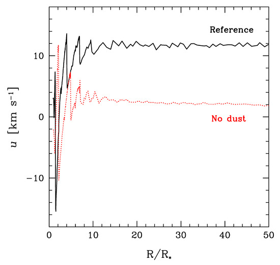 In Figure 6 we present the velocity profiles as a function of the radius coordinate for the Reference model and the model without dust. For both cases we select an advanced phase, in which the mass-loss has already reached its asymptotic regime.