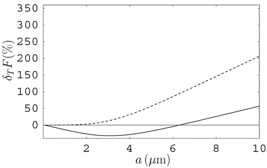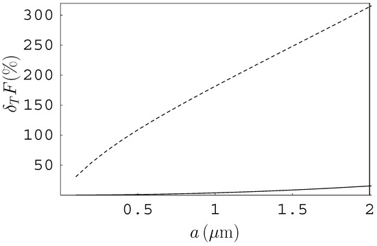 computed by (10) using the Drude model (17) and the plasma (21) dielectric permittivities of gold with eV and eV at K. The computational results in percent are shown in Figure 1 as the functions of separation between the plates by the solid and dashed lines for the Drude and plasma models, respectively.