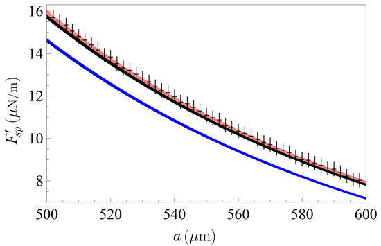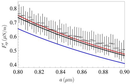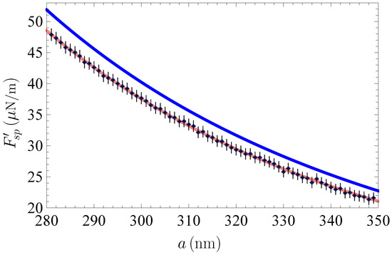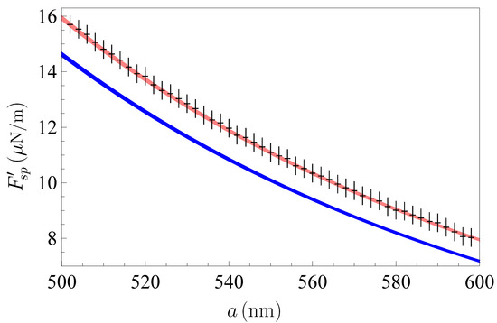 where is the Casimir free energy per unit area of two parallel plates defined in (8), a is the minimum sphere–plate separation, and R in the sphere radius. The error of this approximation was not known precisely at that time but it was expected to be of the order of . As the measurements [20,21,22,23] were performed at μm with the sphere radius μm, this error does not exceed 0.7%. The most precise experiments measuring the Casimir interaction were performed in dynamic mode, where not the Casimir force but its gradient was measured. By differentiating (33) with respect to a, the force gradient is expressed by the Lifshitz formula (10) for the force per unit area of two parallel plates