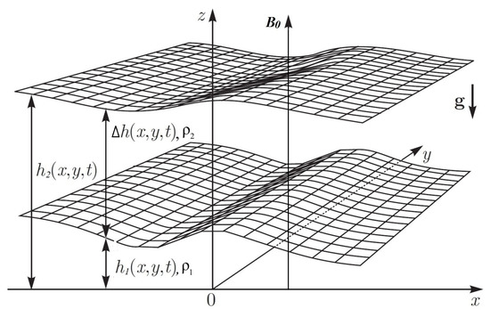 The magnetohydrodynamic equations of stratified plasma in the two-layer shallow water approximation describe flow of a thin layer of plasma with height in gravitational field with external vertical magnetic field , which is divided into two thin layers with heights and and constant but different densities and correspondingly (Figure 1).