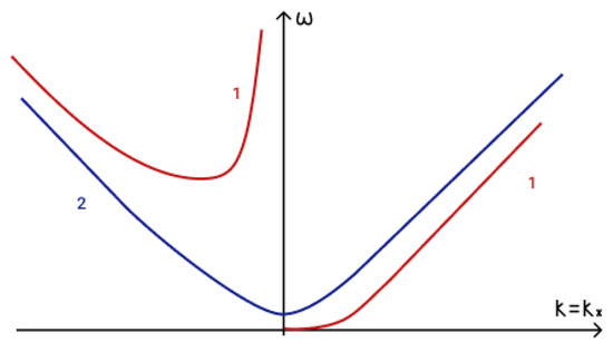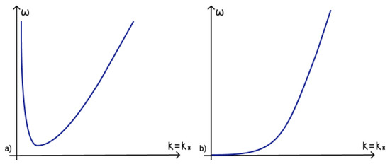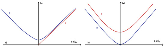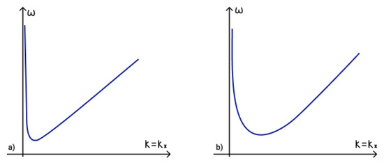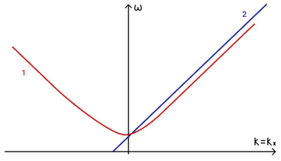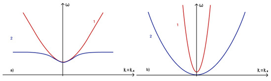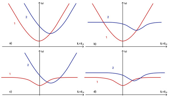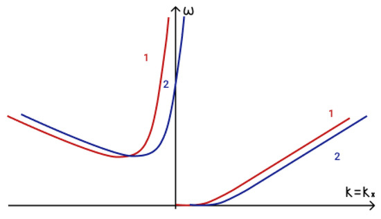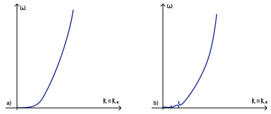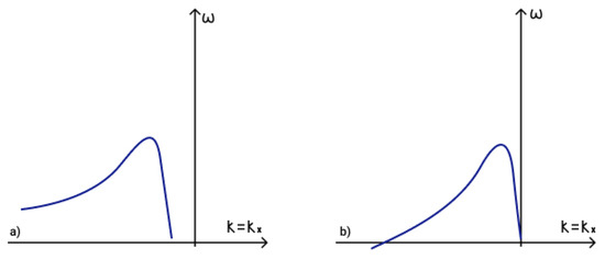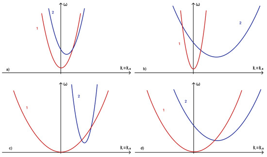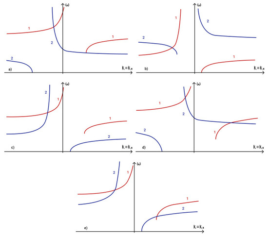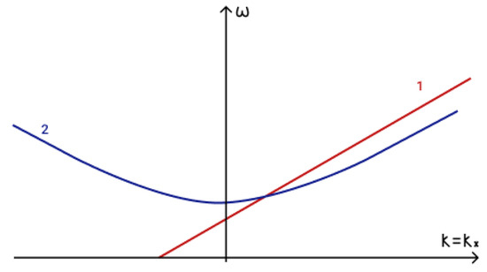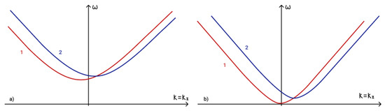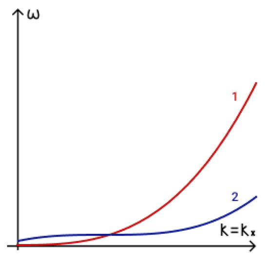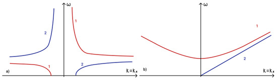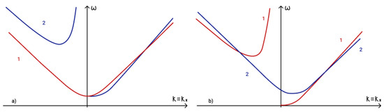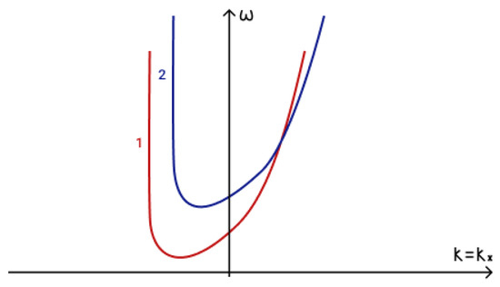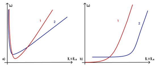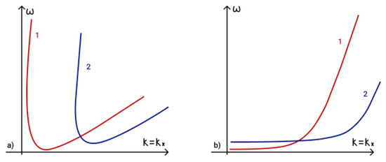 To determine the fulfilment of the phase-matching condition (19) for three interacting waves it is necessary to analyze dispersion curves. The first term in phase-matching condition (19) determines the point () on a dispersion curve. Term determines the point () on a shifted dispersion curve. The intersection of these two curves determines a point () and reveals the fulfilment of the phase matching condition (19). The dispersion curves in the presence of an external vertical magnetic field are illustrated in Figure 5a, while those for the case of a horizontal magnetic field are illustrated in Figure 5b.