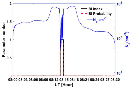 A typical example of an EPB/IBI event observed by Swarm B on March 17, 2015. Black solid line, red dashed line, and blue solid line correspond to the IBI index, the IBI probability, and the (cm−3) profile, respectively.
