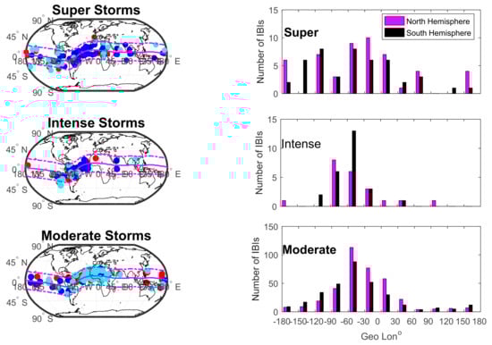 We noticed that regardless of the few IBIs spread farther from the ±20° latitudinal limits, the majority of IBIs were observed closer to or centered around the dip equator. Also, during moderate storms, no IBIs were observed poleward from the ±20° latitudinal limits. In addition, the IBIs observed during moderate and super storms spread over a large range of longitude in comparison with the majority of IBIs during intense storms, which were concentrated within limited longitudes (20° W–90° W). The right column of Figure 2 shows the number of IBIs in the northern and southern hemispheres in magenta and black bars respectively. The range of the Y–axis in both super and intense storms is 15, while for the moderate storm it is expanded to 150 because of the large number of IBIs during moderate storms. We noticed that, 64% of intense storms have a large number of IBI events in the southern hemisphere (Figure 2). In contrast, 59% of moderate and super storms have large IBI events in the northern hemisphere. The number of IBIs in the northern hemisphere is slightly larger than that in the southern hemisphere, at all longitudes, during super, intense, and moderate geomagnetic storms. Consequently, the dramatic increase in the number of IBIs during intense storms within 45° W longitude in the southern hemisphere could be due to the fewer number (36) of IBI events that may mislead the statistical trend.