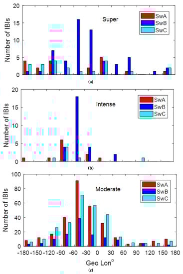 Swarm B orbits the Earth at higher altitudes (~520) km than Swarm A and C, which orbit the Earth at an average altitude of ~420 km; therefore, the probability of observing IBIs during different types of storms at different altitudes is worth investigation. Figure 3a–c displays the number of IBI events observed by the three Swarm satellites with respect to the geographic longitude during distinct types of storms. The red, blue, and cyan bars correspond to IBIs observed by Swarm A, B, and C satellites, respectively. This shows that during super and intense storms, the number of IBIs at the altitudes of Swarm B (>500 km) is larger than those observed at the altitudes of Swarm A and C. Swarm B recorded about 60% of all the events during super and intense storms and 16% during moderate storms. In contrast, during moderate geomagnetic storms, the number of IBI events observed by Swarm A and C is always larger than those detected by Swarm B as shown in Figure 3c. The occurrence rates of IBIs at the altitudes of Swarm A and C satellites are the maximum (83%) during moderate storms. For all types of storms, the majority of IBI events are observed within the longitudinal sector (0° E and 110° W) or within the location of the SAA.