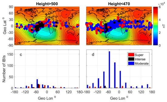 Figure 4a,b introduces the geographic locations of IBIs observed at different heights according to different storm types. Super, intense, and moderate storms are marked in red, black, and blue dots respectively. These IBIs are superimposed on a map of the total Earth’s main magnetic field that was calculated from the CHAOS−7.4 model at 450 km altitude [58]. The total Earth magnetic field varies up to 60,000 nT as indicated by the color bar index at the rightmost of Figure 4b. The map shows that the minimum magnetic field values of the Earth are located over the Atlantic Ocean between Africa and South America (called SAA). A comparison between the geomagnetic map and the number of IBIs shows that the number of IBIs increases dramatically over SAA at both altitudes.