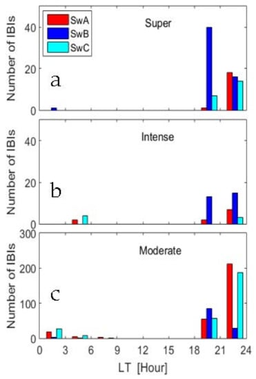 The occurrence of IBIs with respect to local time during various types of storms is presented in Figure 5a–c. It is generally noticed that the majority of IBIs are observed between sunset and midnight (18:00–24:00 LT) and few events are observed from post-midnight until the early morning (24:00–06:00 LT). During both super and intense storms, Swarm B recorded a larger number of IBIs in comparison with Swarm A/C. These Swarm B events are observed around the post-sunset hours (18:00–21:00 LT). In contrast during moderate storms, the large number of IBIs are recorded by Swarm A/C and are observed within the pre-midnight hours (21:00–24:00) LT.