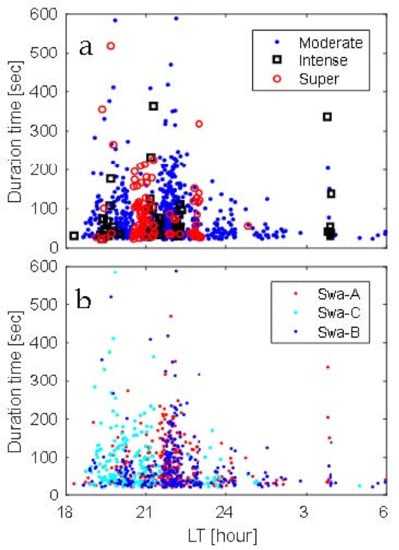 The duration times of IBIs during super, intense, and moderate geomagnetic storms in red circles, black squares, and blue dots, respectively, are shown in Figure 6a. The occurrence rates of IBIs with duration times <100 s are 65%, 80%, and 73% corresponding to super, intense, and moderate storms, respectively; while for duration times >100 s corresponding to the same order of storms, the occurrence rates are 34%, 19%, and 25%. However, the percentage of IBIs with duration times >100 s is the largest during super storms. Moderate storms showed a larger percentage than intense storms.