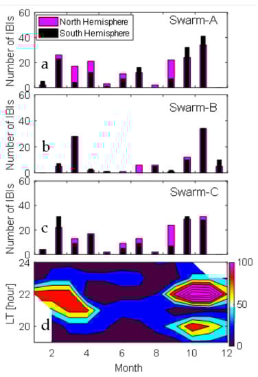 Figure 7a–c illustrate the number of IBIs with respect to months at the altitudes of Swarm A, B, and C from top to bottom. The numbers of IBIs in the northern and southern hemispheres are marked in magenta and black bars respectively. In both hemispheres, the numbers of IBIs in the months around equinoxes are always larger than the number of IBIs in the summer and winter months. This seasonal variation of the occurrence rate of IBIs is independent of the altitude of Swarm satellites. It is worth noting that we could not make a seasonal variation of the number of IBIs for each type of geomagnetic storm because of the limited number of super and intense storms. This limited number of storms confined the appearance of IBIs within two months during super storms and five months during intense storms as indicated in Table 2. Thereby, the seasonal variations of IBIs during different types of geomagnetic storms are suggested to be investigated in further studies. The number of IBIs in the northern hemispheric summer is larger than in the southern hemisphere. This large occurrence could be attributed to the large electron that develops steeper according to Equation (1).