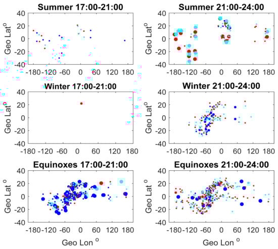 Figure 8 shows the seasonal variations of IBIs observed during sunset (17:00–21:00) and pre-midnight (21:00–24:00) local times. IBIs observed by Swarm A, B, and C are marked in red, blue, and cyan colors, respectively. The size of the circle from small to large corresponds to the storm level from moderate to super. The most remarkable points here are, first, the majority of IBIs are observed within the pre-midnight period in all seasons, second, the absence of IBIs during winter months during sunset (local times). The absence of super storm IBIs during the winter months is attributed to the only two super storms that occurred during March and June months. The occurrence of super storm IBIs increases within the pre-midnight period during summer months and sunset during equinoxes. The low occurrence of super EPBs in comparison with moderate EPBs during summer months within the sunset is in agreement with the authors of [53] who found that the number of post-sunset EPBs during quiet periods is larger than those observed during disturbed periods. This low occurrence of super storm IBIs during summer months (sunset) is reversed in local time during equinoxes, which is a novel feature of IBIs in our analysis. The absence of sunset IBIs during winter months could be attributed to the trans−equatorial wind that suppresses the occurrence of EPBs in the winter hemisphere as reported in previous studies, but confirming this suggestion needs further investigation.