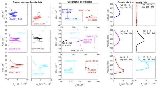The profiles during super, intense, and moderate geomagnetic storms are shown in the rows from top to bottom, respectively. The middle column shows the geographic coordinates of the Swarm and COSMIC satellites, while the left and right columns correspond to data observed by Swarm and COSMIC satellites, respectively.