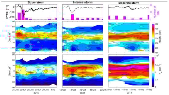 During super storms (upper row), the data are not only dramatically decreased/depleted in comparison with other storms, but also the hmF2 is displaced to higher altitudes ~ 400 km. However, these two features are not observed simultaneously for the same event, they are clearly observed independently in our observations of the IBIs occurring on 23 and 24 June 2015. COSMIC−RO observation extends to broad longitudes as shown in the middle panel of the upper row, which means irregularities observed by Swarm satellites extend to large longitudes. Also, Swarm data are intensively disturbed/depleted over a wide range of latitudes due to the existence of large plasma irregularities, which could be seen along the path of Swarm satellites. Moderate geomagnetic storms show low degradation in comparison with super and intense geomagnetic storms. Also, the hmF2 is observed at lower altitudes. Several authors have attributed the intense dynamics of the ionospheric irregularities during super geomagnetic storms to auroral activities [59]. Regardless, the degradation degree increases with the storm activity level, it is hard to correlate it with the size of areas exposed to degradation. This issue is difficult to investigate using the longitude criterion because of the fewer number of space observatories whereas COSMIC is closer to Swarm for the same IBI event.