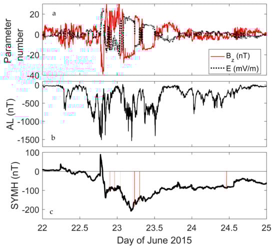 The solar wind and geomagnetic indices associated with the super storm observed from 22 June 2015 to 24 June 2015. (a) The IMF Bz and solar wind electric field, (b) The AL index, and (c) The SYMH index.