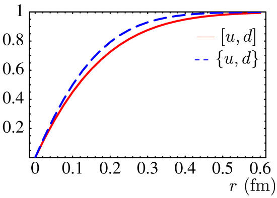 Such a form factor smears the one-gluon exchange potential and removes spurious singularities in the local relativistic quasipotential, thus allowing one to use it nonperturbatively to find the numerical solution to the quasipotential equation. The masses and parameters of light, heavy–light and doubly heavy diquarks are the same as in the heavy baryons [14,19,22,27] and are given in Table 2 and Table 3. As in the case of heavy baryons, we consider diquarks in the ground states only. In Figure 1 we plot, as an example, the form factors for the light scalar and axial vector diquarks. For other diquarks, the form factors have a similar form. As we see, the functions vanish in the limit and reach unity for large values of r. Such a behaviour can easily be understood intuitively. At large distances, a diquark can be approximated well by a point-like object, and its internal structure cannot be resolved. When the distance to the diquark decreases, the internal structure plays a more important role. As the distance approaches zero, the interaction weakens and turns to zero for , since this point coincides with the center of gravity of the two quarks forming the diquark. Thus, the function makes an important contribution to the short-range part of the interaction of the light and heavy diquark in the tetraquark, and can be neglected for the long-range (confining) interaction.