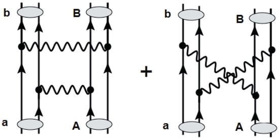 Keeping this goal in mind, the program of this paper is a purely theoretical one, namely to recast the second-order DSCE reaction amplitude into an s-channel representation. As seen below, this requires a demanding amount of recoupling of various kinds of angular momenta, including the spectroscopic ones intrinsic to the involved nuclei and those describing the multipolarities acting on the relative motion degrees of freedom. Moreover, the total number of form factors to be considered increases to the fourth power (or stronger) by the number of elementary NN-interaction vertices. Thus, the full account of rank-0 central, rank-1 spin orbit, and rank-2 tensor NN-vertices results in general in a total of at least form factors, distributed half by half in the projectile and target. In order to keep the presentation at a manageable level, we therefore restrict the discussion to the vertices of the rank-0 central interactions. As was discussed already in References [,], they involve already the complete set of relevant fundamental isovector vertices, describing non-spin flip Fermi-type and spin-flip Gamow–Teller-type nuclear transitions of any multipolarity. The algebraic rules developed below can be used in the same manner also for more extended sets of NN-vertices. Practical calculations, e.g., those in Reference [], account of course for the complete set of interactions.