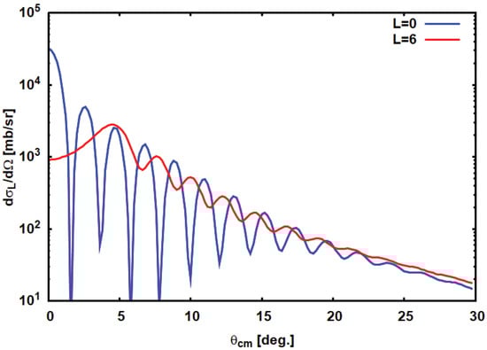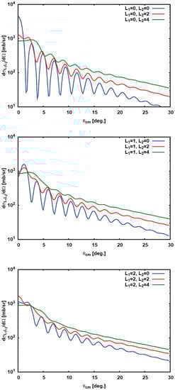 Second-order DSCE unit strength cross sections for the reaction at MeV. From top to bottom, results are shown for total angular momentum transfer in the first single charge exchange (SCE) interaction and the second SCE interaction , respectively. The average excitation energy was chosen as MeV. The angular range corresponds to momentum transfers up to 1000 MeV/c. Optical potentials and transition potentials are calculated in a double folding approach by using the (newly derived) nucleon–nucleon (NN) T-matrix at MeV, parameterized as in References [,]. Optical potentials are calculated with Hartree–Fock–Bogoliubov (HFB) ground state densities according to Reference []. The cross sections are calculated by using average form factors derived from QRPA transition densities as discussed in the text. For comparison, SCE unit strength cross sections are shown in Figure 3.