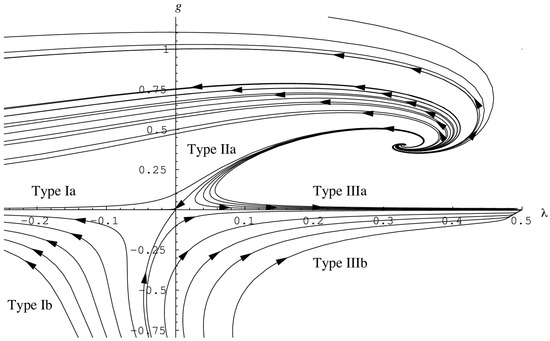 Type Ia trajectories on the other hand decompose into two branches with and , respectively. On each branch separately, setting is an allowed change of coordinates. On the upper (lower) branch, the RG time becomes a strictly decreasing (increasing) function of k then. However, employing globally would create a 2-1 ambiguity where .
