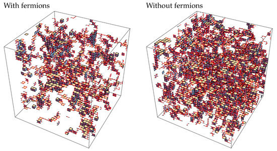 This quantifies the percentage of the respective structures depicted in Figure 4. When fermions are present, we clearly have a higher proportion of unit cubes and a lower proportion of bottlenecks than without fermions.