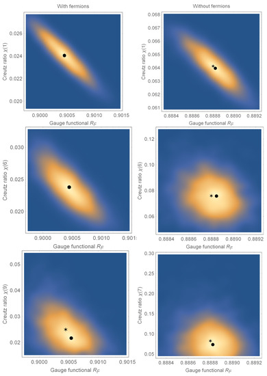 with Wilson loops of size . Some probability densities for the relation between the values of the gauge functional and the Creutz ratio for individual configurations are shown in Figure 2. This determination is based on 40 configurations with 100 gauge copies for configurations with (left) and without (right) dynamical fermions. For Creutz ratios of small Wilson loops, we observe a nearly linear relation between the two quantities reflecting the finding of Bornyakov et al. [14]: there exist gauge copies of the configurations with maximal and very low . With increasing size of Wilson loops, this correlation weakens. Nevertheless, the request to maximize the gauge functional (9) fails.