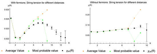 The average and most probable values of are compared for simulations with and without fermions. This complements the probability densities of Figure 2. The increasing discrepancy between the two quantities with larger R can probably be explained by the low precision of Creutz ratios of single configurations. Until the values start to deviate from one another, the variations of are of the order of 10%. For comparison, we show also the more precise Creutz ratios extracted from averages of Wilson loops.