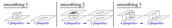 The smoothing steps 1–3 cut out parts of the vortex surface and closes the emerging holes with a flat surface. In this way, short-range fluctuations of the vortex surface are suppressed. We first count the P-plaquettes without any smoothing performed, and then the loss of P-plaquettes for the respective smoothing steps is determined. The results are given in Table 1.