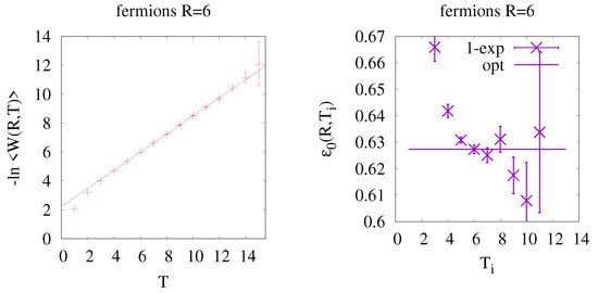 An example for a 1-exponential fit to Wilson loops for given R and (see Equation (2)) is shown in the left diagram of Figure 5. The dependence of this example on the initial is depicted in the right diagram.